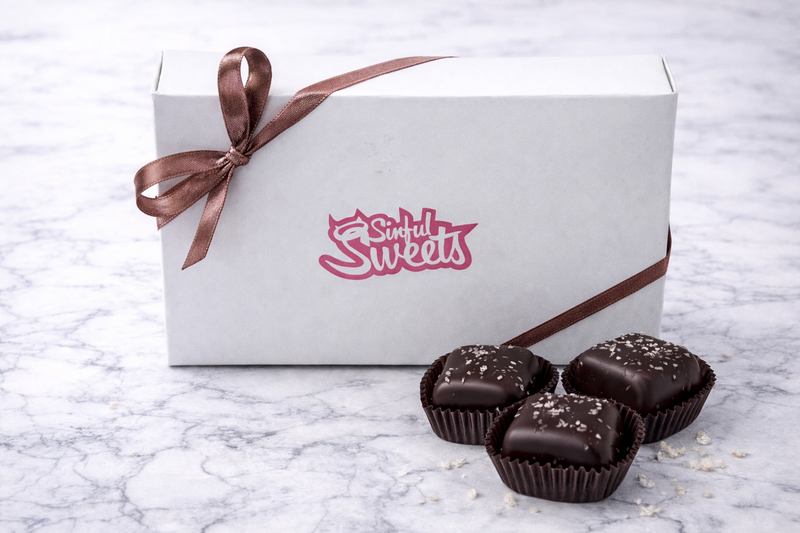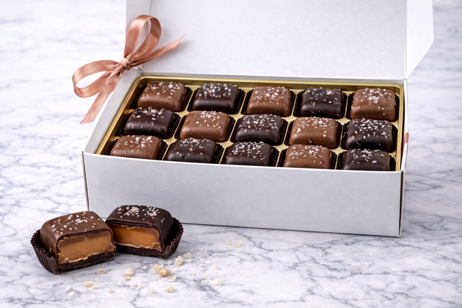 Indulge in our signature salted caramel truffles—a dozen hand-crafted pieces balancing sweet and savory notes. Six velvety milk chocolate truffles pair with six rich dark chocolate versions, each enrobing a buttery caramel center finished with a whisper of sea salt. A refined selection that showcases the complexity of quality chocolate and the art of truffle-making.