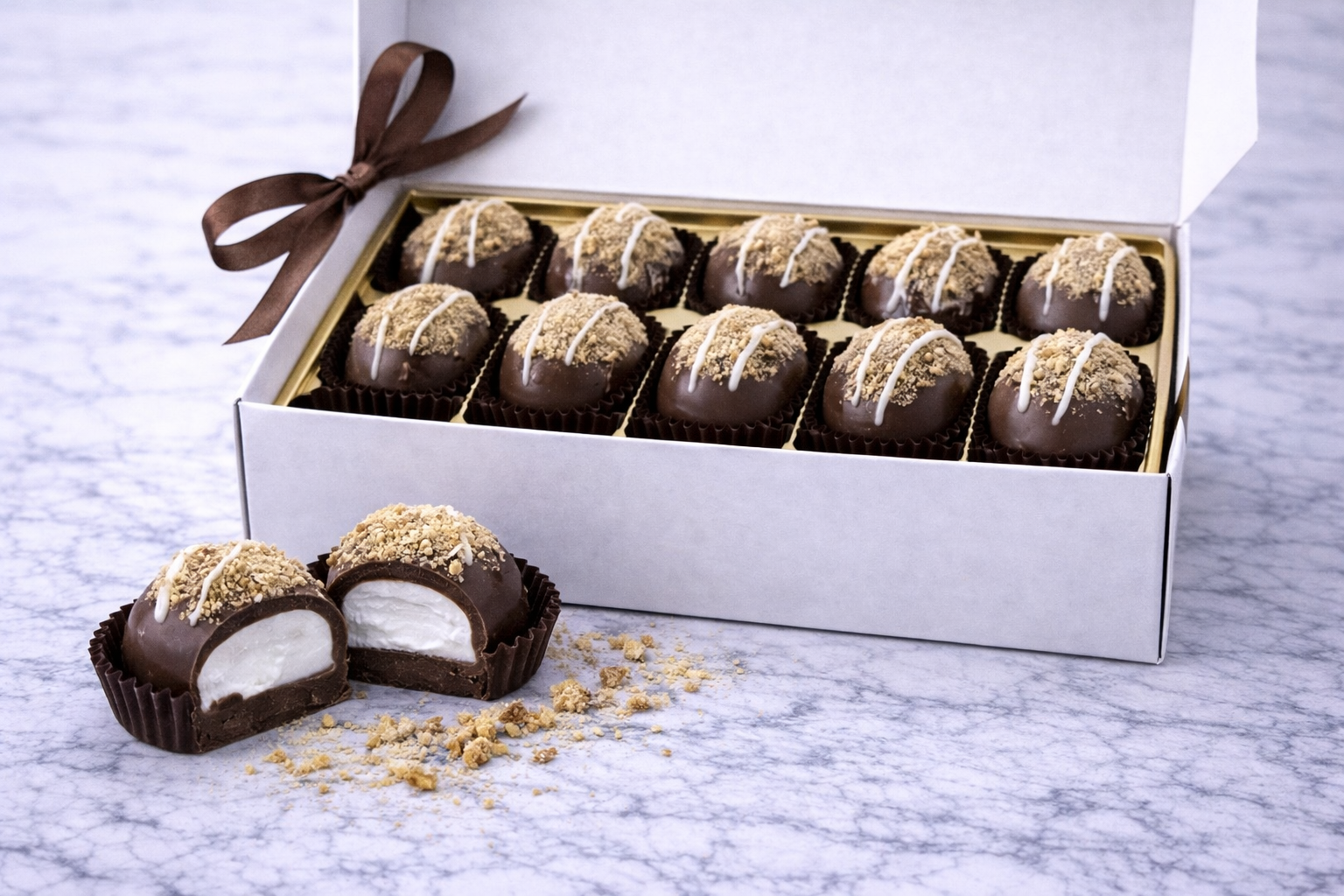 Indulge in the ultimate campfire classic reimagined as an elegant truffle. Each piece features velvety marshmallow fluff enrobed in smooth milk chocolate and finished with a delicate graham cracker crumble. This 12-piece collection captures the nostalgic charm of s'mores in a sophisticated, bite-sized form—perfect for gifting or savoring yourself. A modern twist on a timeless favorite that melts on your tongue.