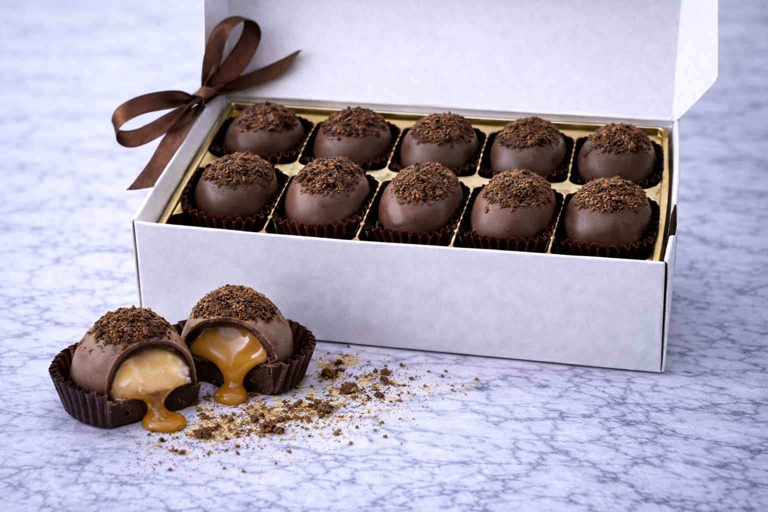 Experience the perfect marriage of coffeehouse sophistication and artisanal chocolate craftsmanship. Our Caramel Latte Truffles blend rich salted caramel with bold espresso, all enveloped in decadent dark chocolate and crowned with a fresh espresso accent. Each truffle delivers a sophisticated flavor journey—sweet, salty, and boldly caffeinated. Ideal for coffee lovers seeking an indulgent escape in every bite.