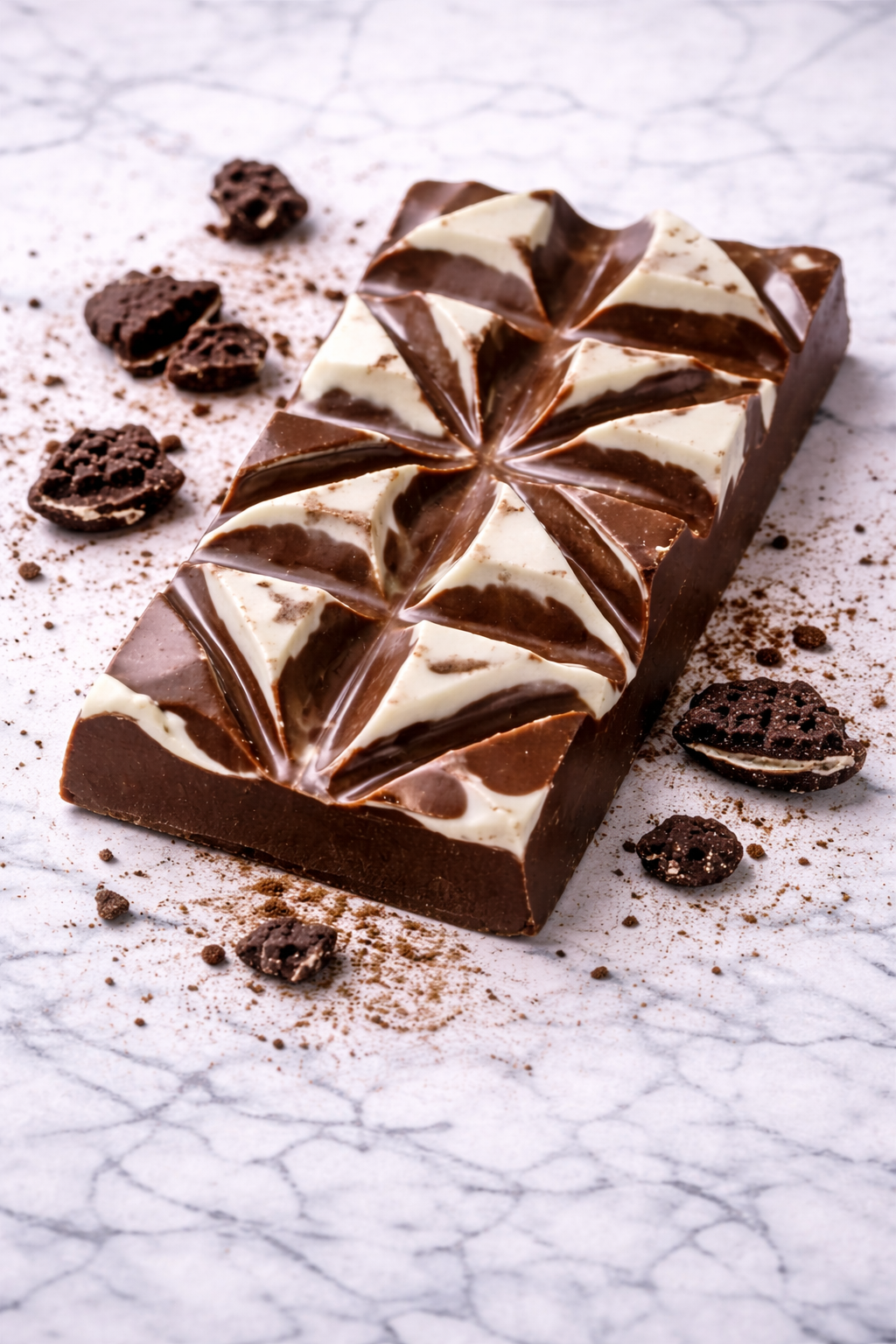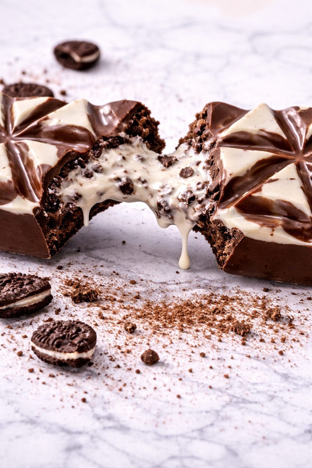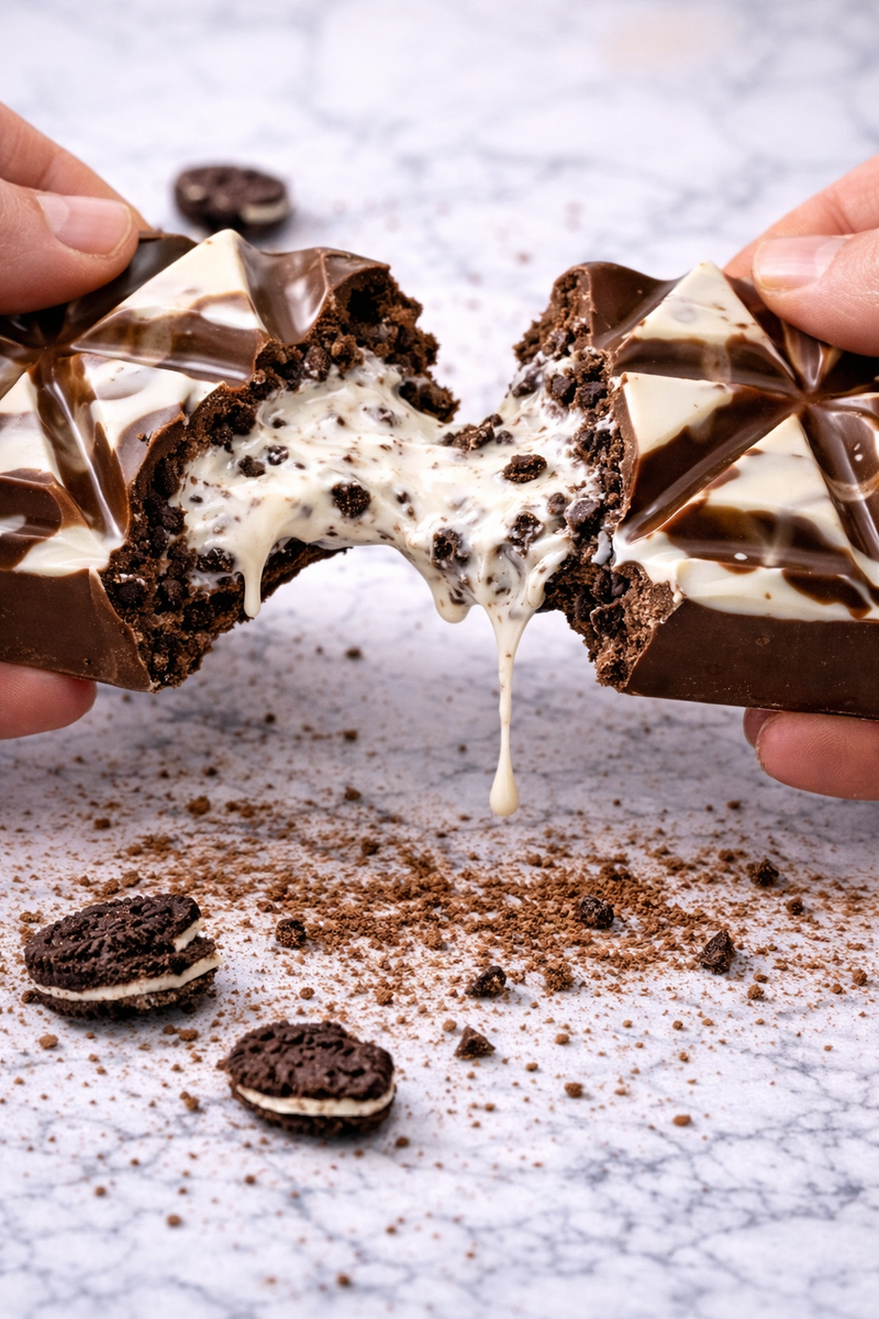 A swirl of silky milk and white chocolate marbled together, stuffed to the brim with luscious vanilla cream and crushed Oreos. It's the ultimate bar for cookie lovers and dream chasers alike.