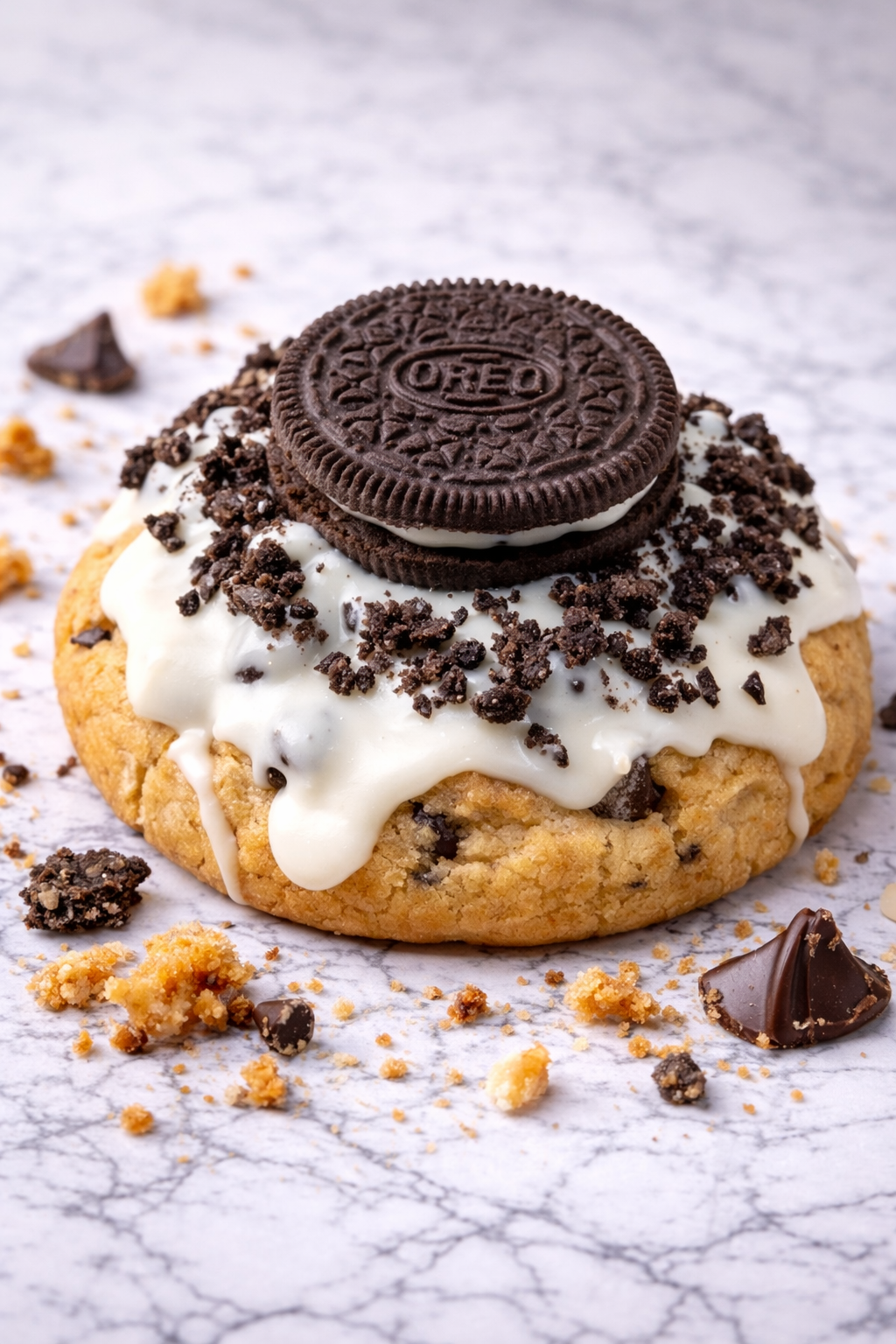 Indulge in six of our signature half-pound chocolate cookies, each generously filled with rich fudge and encrusted in crushed Oreo crumbs. Every cookie is crowned with a layer of creamy white chocolate and finished with a whole Oreo cookie for the ultimate textural contrast. These deep-dish cookies deliver an expertly balanced combination of dark chocolate, sweet fudge, and iconic cookie flavors in one decadent package.